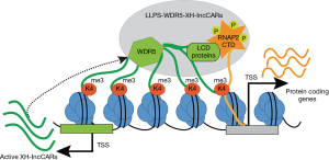 In summary, Subhash et al. characterized a new category of active (H3K4me3/WDR5) XH-lncCARs and functionally demonstrated that the presence of XH lncCARs is required to maintain the transcriptionally competent chromatin at their paired protein coding genes and that WDR5 establishes the H3K4me3 mark at XH-lncCARs promoters. Notably, authors showed that transient overexpression of target XH-lncCAR cannot activate the expression of their divergent protein coding partner gene, suggesting that XH-lncCAR needs to be transcribed in cis to fulfil its functional effect on protein coding genes. Given the fact that WDR5 is predicted to contain intrinsically disordered regions (IDRs) that are conserved through vertebrate species (21) these findings open the possibility that WDR5 alone or in combination with of other low complex domain (LCD) proteins of the transcription machinery favors the formation liquid-liquid phase transition (LLPS) with RNAP2-CTD (22,23) and proposed model presented in Figure 1.